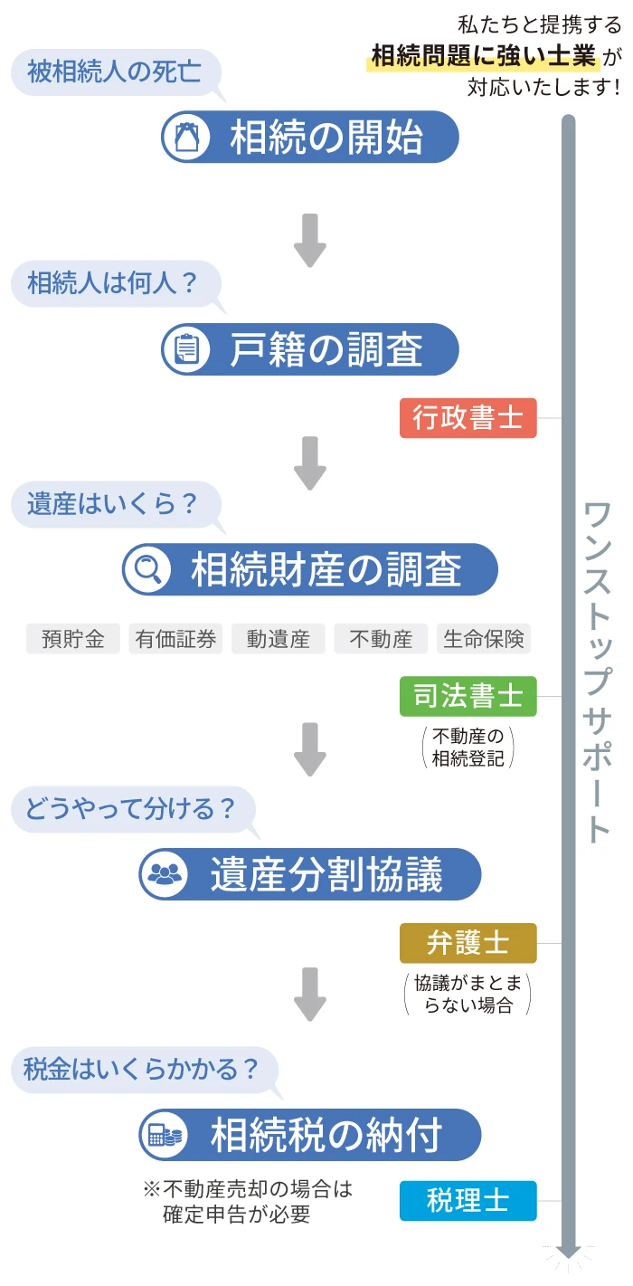 相続する財産があり、相続税が発生する場合もご安心ください。相続人の調査から相続税の納付・申告まで、私たちと提携する各分野の専門家(士業)が連携し、以下のようなフローで実務を進めていきます。